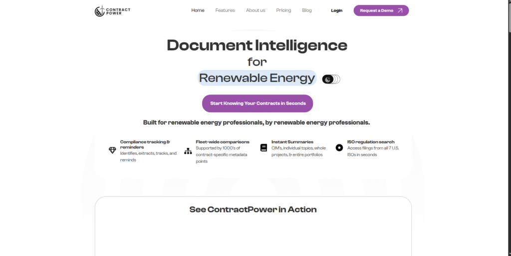 ContractPower is an AI-driven document intelligence platform built specifically for renewable energy organizations. It accelerates compliance review, contract analysis, and risk identification by combining domain-trained models with workflows tailored to the unique demands of energy developers, asset managers, and legal teams.