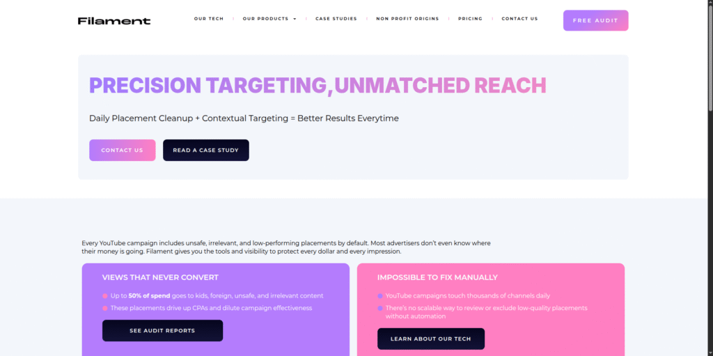 Filament was created to solve a serious problem. Too many ads were being placed next to unsafe misleading or irrelevant content. Brands were paying for views that damaged trust and delivered little value. Advertisers had no real visibility. Campaigns ran across thousands of channels without control. The message was reaching people but not in the right environments. We built Filament to change that. By combining technology with hands on human validation we created a system that filters out low quality placements and keeps your content aligned with trusted relevant channels. Every feature was designed with real brands in mind. From global advertisers to growing organizations Filament offers a reliable system where safety relevance and performance work together. The goal is not just impressions. It is clean meaningful and effective reach.